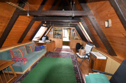 Im Wohnzimmer befindet sich noch die originalen, gut erhaltenen Holzwandpaneele, und Holzdecken