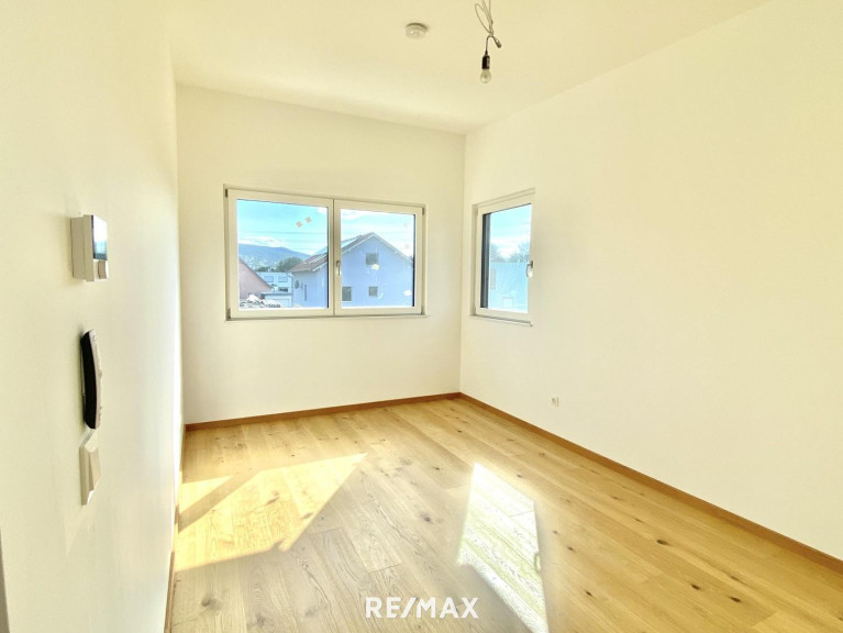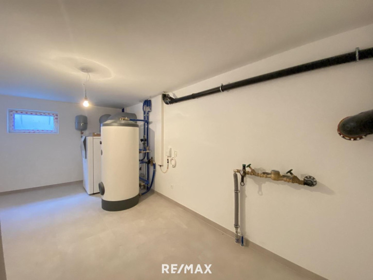 Für reichlich Tageslicht sorgen die elektrisch bedienbare Lichtkuppel im Obergeschoß sowie die bodentiefen Fenster auf der Südostseite im Erdgeschoß. Dank des Pultdaches beträgt die Raumhöhe im Obergeschoß bis zu 3 Meter und lässt die Räume noch großzügiger wirken. Das ganze Haus wird mittels einer Fußbodenheizung temperiert, was im Zusammenhang mit den hochwertigen Echtholzdielenböden für ein besonders behagliches Wohnklima sorgt. Auch das Untergeschoß verfügt über eine Fußbodenheizung und ist als Fitnessraum, Home-Office oder erweiterter Wohnraum geeignet. Die Heizung wird von einer ökologisch nachhaltigen Luft-Wasser-Wärmepumpe inklusive Kühlfunktion gespeist. Elektrisch bedienbare Außenrollläden gehören ebenso zur Grundausstattung.