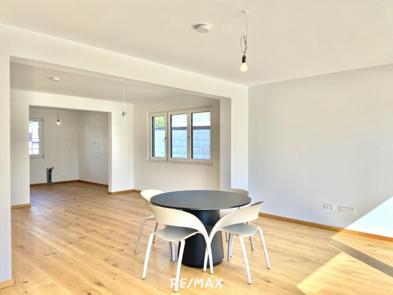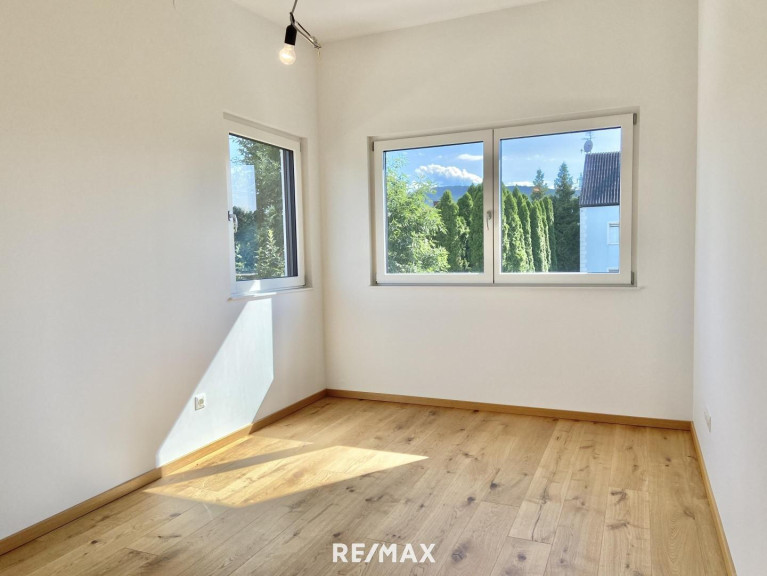 Für reichlich Tageslicht sorgen die elektrisch bedienbare Lichtkuppel im Obergeschoß sowie die bodentiefen Fenster auf der Südwestseite im Erdgeschoß. Dank des Pultdaches beträgt die Raumhöhe im Obergeschoß bis zu 3 Meter und lässt die Räume noch großzügiger wirken. Das ganze Haus wird mittels einer Fußbodenheizung temperiert, was im Zusammenhang mit den hochwertigen Echtholzdielenböden für ein besonders behagliches Wohnklima sorgt. Auch das Untergeschoß verfügt über eine Fußbodenheizung und somit als Fitnessraum, Home-Office oder erweiterter Wohnraum geeignet. Die Heizung wird von einer ökologisch nachhaltigen Luft-Wasser-Wärmepumpe inklusive Kühlfunktion gespeist. Elektrisch bedienbare Außenrollläden gehören ebenso zur Grundausstattung.