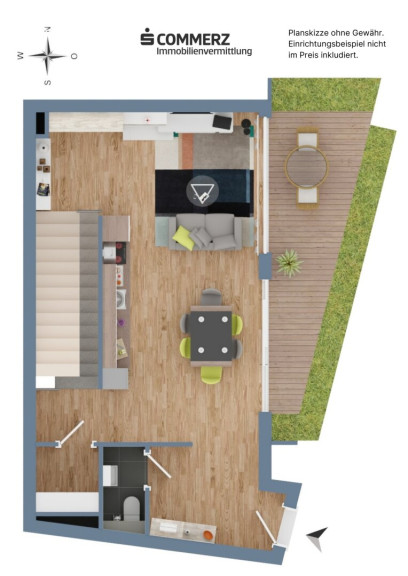 Ausstattung gemäß Baubeschreibung (die dargestellte Möblierung ist nicht Bestandteil des Lieferumfanges und dient nur als Einrichtungsvorschlag). Alle dargestellten Gegenstände haben symbolhaften Charakter. Druck- und Satzfehler, sowie Irrtümer und baulich bedingte Änderungen vorbehalten. Die Wohnungsgrößen sind Circa-Angaben und können sich durch die Detailplanung geringfügig ändern. Auch eventuelle Preisänderungen behält sich der Errichter vor. Maßgeblich ist in jedem Fall der Kaufvertrag.