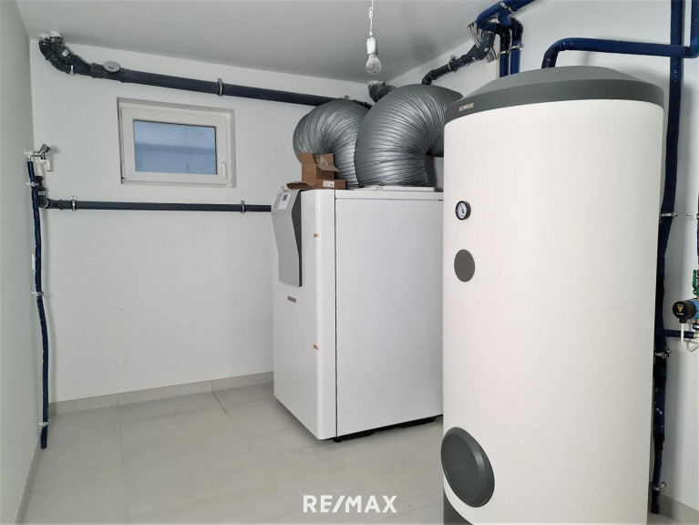 Für reichlich Tageslicht die bodentiefen Fenster auf der Gartenseite. Dank des Pultdaches beträgt die Raumhöhe im Obergeschoß bis zu ca. 3,25 Meter und lässt die Räume noch großzügiger wirken. Das ganze Haus wird mittels einer Fußbodenheizung temperiert, was im Zusammenhang mit den hochwertigen Echtholzdielenböden für ein besonders behagliches Wohnklima sorgt. Auch das Untergeschoß verfügt über eine Fußbodenheizung und kann somit beispielsweise als Fitnessraum, Home-Office oder erweiterter Wohnraum genutzt werden. Die Heizung wird von einer ökologisch nachhaltigen Luft-Wasser-Wärmepumpe inklusive Kühlfunktion gespeist. Eine Klimaanlage und Außenrollläden gehören ebenso zur Grundausstattung. Somit bleibt Ihr Haus auch in den heißen Sommertagen angenehm temperiert.