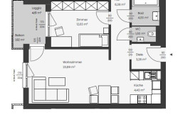 Über den Vorraum bzw. den anschließenden Gang sind alle Räume zentral zu erreichen. Der offen gestaltete Koch-, Wohn- und Essbereich bildet das Herzstück der Wohnung - von hier gelangen Sie auch auf die (von der angrenzenden Wohnung uneinsehbare) Loggia. Die Wohnung verfügt darüber hinaus über zwei Schlafräume, einen großzügigen Schrankraum, ein Badezimmer mit Wanne und Waschtisch und natürlich über ein separates WC.
