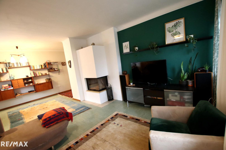Im Erdgeschoß finden sich das lichtdurchflutete Esszimmer und die offen gestaltete Küche, das daneben befindliche, behagliche Wohnzimmer mitsamt Kamin, sowie ein derzeit als Schrankraum bzw. Büro genutztes kleineres Zimmer und ein WC.