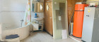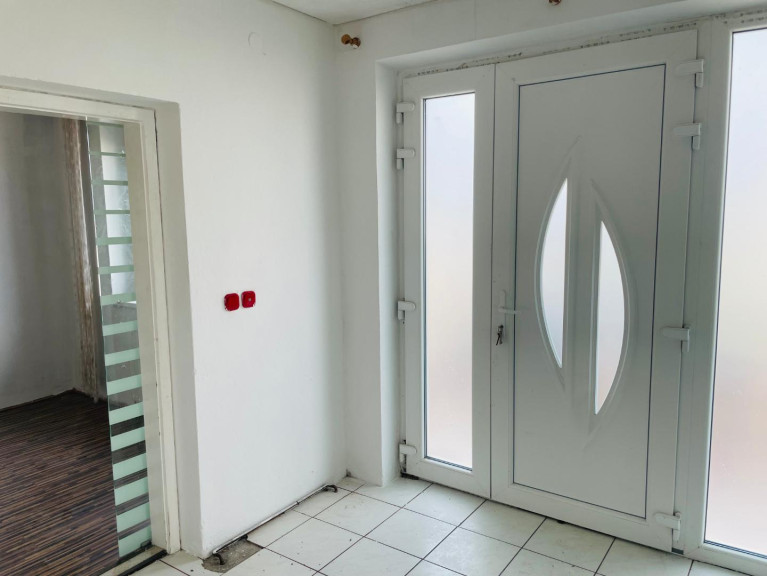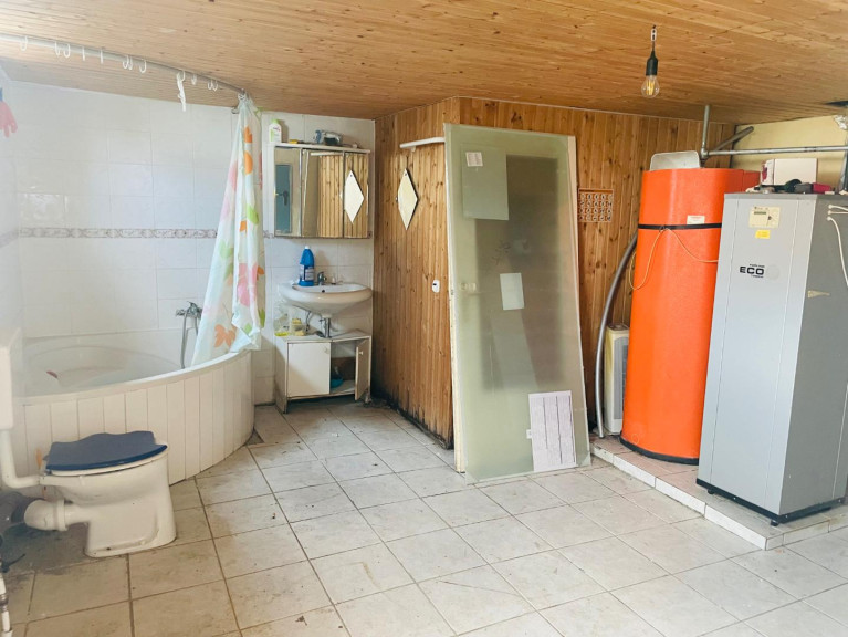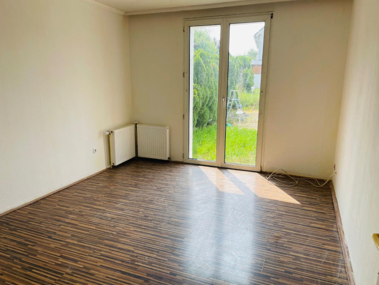 Man gelangt über eine Treppe in das höher gelegene Erdgeschoss. Über den Eingangsbereich gelangt man ins Treppenhaus zum Keller, ins Wohnzimmer und von dort aus in die Küche. Durch ein zweites Vorzimmer kommt man in das WC, das Badezimmer sowie das Schlaf- und Kinderzimmer. Das Badezimmer ist mit einer Eckbadewanne ausgestattet.