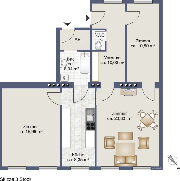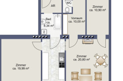 Sie gliedert sich in Vorraum, Wohnzimmer, 2 Schlafzimmer, Küche mit Platz für einen Esstisch, Bad, extra WC und Abstellraum.