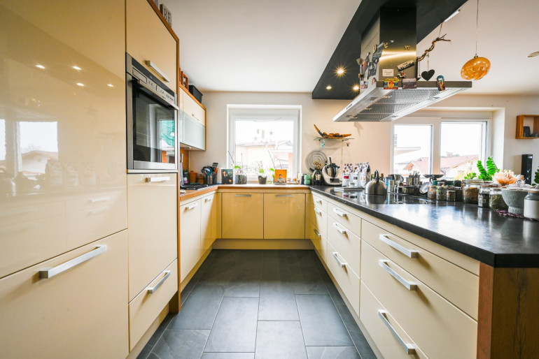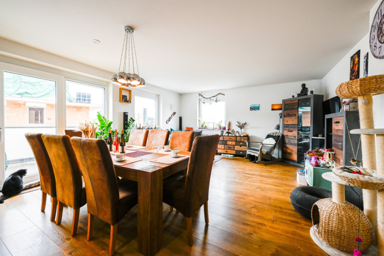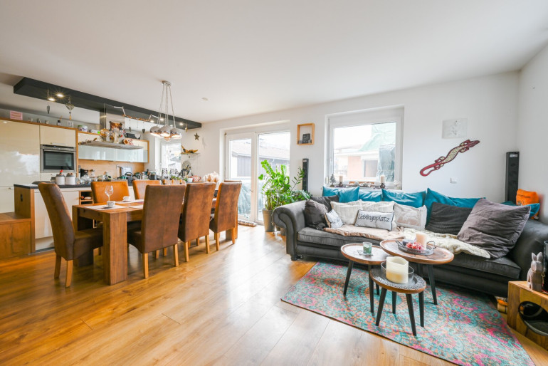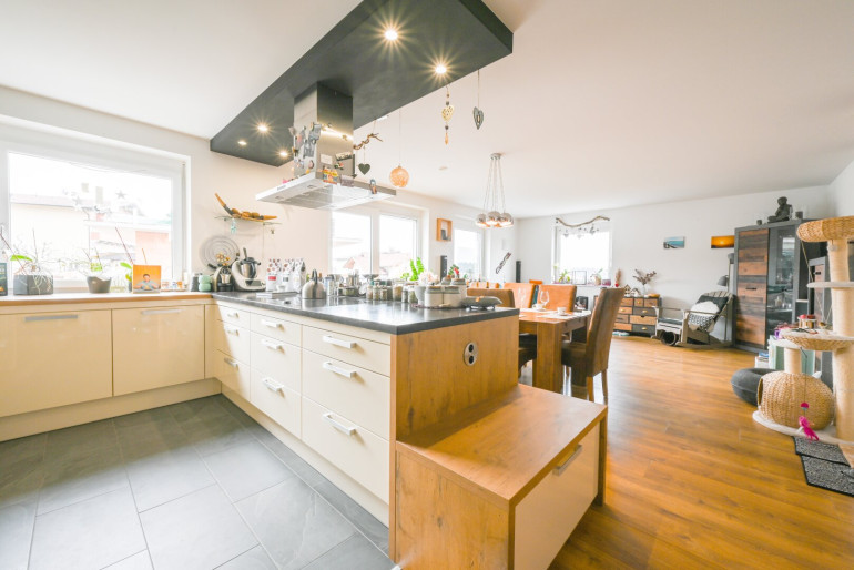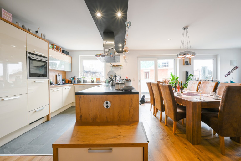 Die helle und lichtdurchflutete 3-Zimmer-Eigentumswohnung mit großzügigen 99 m² bietet ein modernes und komfortables Wohngefühl. Die sonnige Süd-Westterrasse garantiert sonnige Stunden von früh bis spät. Der zentrale Eingangsbereich bietet ausreichend Platz für Jacken und Schuhe. Der helle Wohn-, Koch- und Essbereich ist auf die Terrasse ausgerichtet und schafft eine offene, freundliche Atmosphäre. Die moderne Küche mit Kochinsel lädt zum gemeinsamen Kochen ein, während der ausgedehnte Essbereich viel Platz für Familien und Freunde bietet. Daran angeschlossen befindet sich ein Abstellraum, um nicht alltäglich gebrauchte Gegenstände und Lebensmittel zu verstauen.