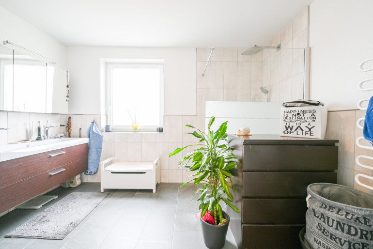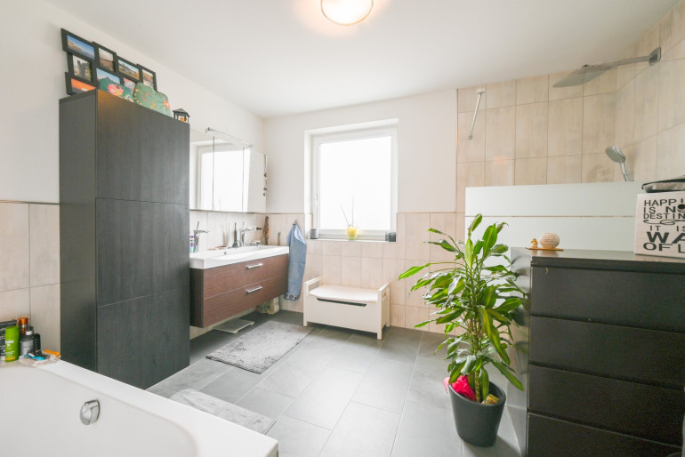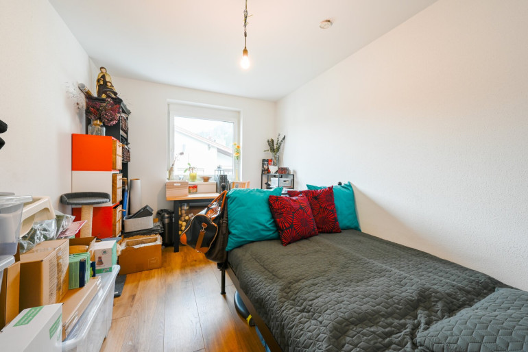 Das gemütliche Wohnzimmer ist der perfekte Ort zum Entspannen und Kraft tanken. Das Badezimmer ist mit einem Waschtisch, einer Badewanne, einer großen Dusche sowie einem Waschmaschinenanschluss und Handtuchtrockner ausgestattet. Abgetrennt davon befindet sich das WC mit Handwaschbecken. Das großräumige Elternschlafzimmer bietet Verdunkelungsmöglichkeiten für ruhige Nächte. Zudem gibt es ein Kinderzimmer, das auch als Büro genutzt werden kann. Diese Wohnung vereint Funktionalität und Wohlfühlatmosphäre auf einer großzügigen Fläche.