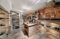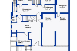 Von der Straße gelangt man durch den Vorgarten zum repräsentativen Eingang, der sich in ein großzügiges Entree öffnet. Dort befinden sich Garderobe, Zugänge zum Gäste-WC, Fitnessraum mit Sauna, Dampfbad, Dusche und Ausgang in den Garten, Wirtschafts-/Technikraum und Garage mit Weinkeller.