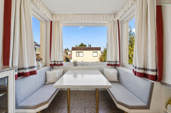 Eine Freitreppe führt in die Wohnebene mit lichtdurchflutetem Salon, offen zum Speisezimmer mit Panoramafenster ins Grüne, und Ausgang auf die südwestseitig gelegene Gartenterrasse und Pool. Der helle Vorraum stellt die Verbindung zur separaten Wohnküche dar, die über einen entzückenden Frühstücksplatz mit Aussicht im Erker verfügt. Weiters befindet sich ein Gäste-WC und ein Abstellraum auf dieser Ebene.