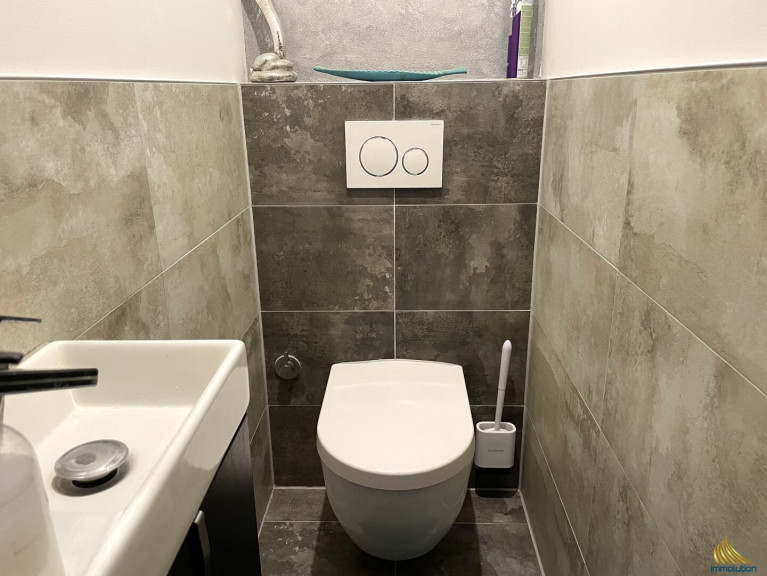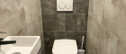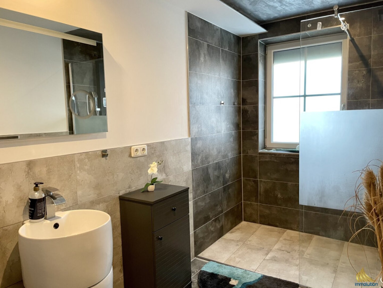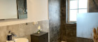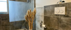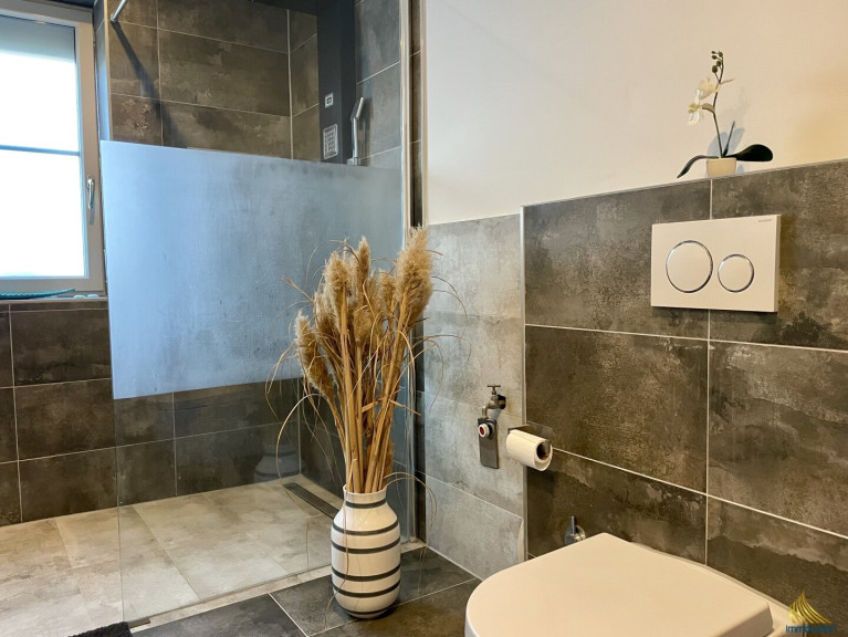 Das moderne Badezimmer verfügt über eine große, begehbare Dusche, ein Fenster und eine Toilette. Zusätzlich sorgt eine separate Gästetoilette für mehr Komfort. Eine kleine Terrasse, die direkt von der Wohnung aus zugänglich ist, lädt zu entspannten Momenten im Freien ein.