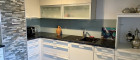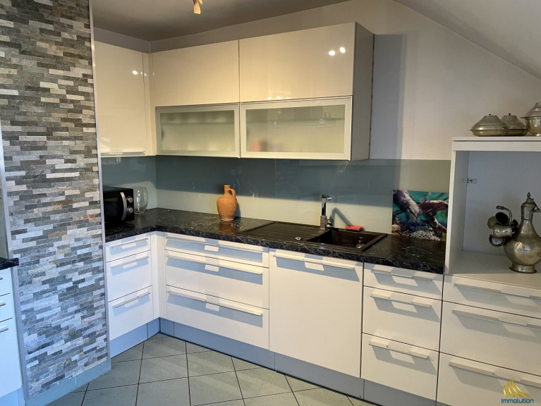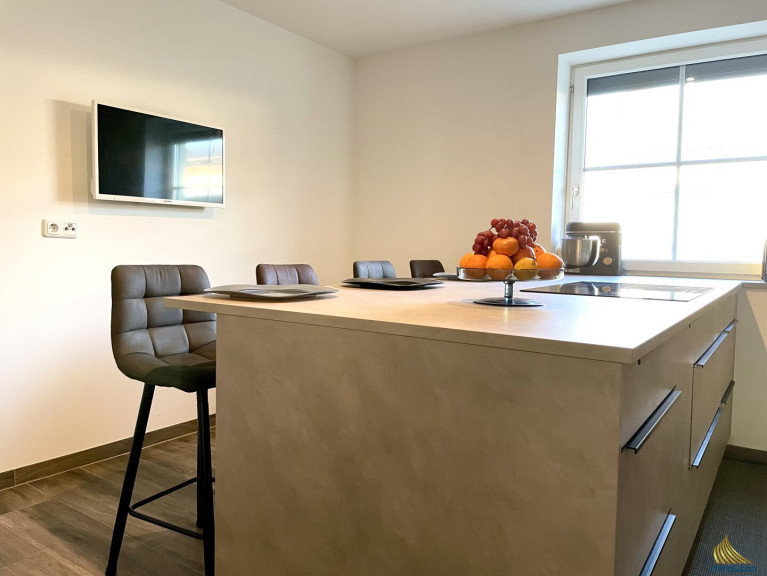 Die zweite Wohneinheit im Obergeschoss bietet auf 118 m² eine durchdachte Raumaufteilung mit viel Licht und Offenheit. Der großzügige Wohn-, Ess- und Küchenbereich mit Kachelofen schafft eine gemütliche Atmosphäre. Die moderne Küche bietet viel Platz für Hobbyköche und wird durch eine praktische Speisekammer ergänzt.