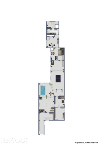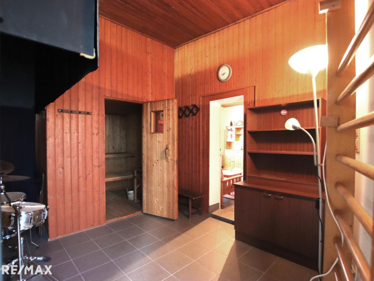 Die Halle wurde ca. im Jahr 1997 saniert und verfügt über 2-fach verglaste Fensterflächen. Ebenso wurden die Böden, Wandverkleidungen etc. erneuert. Die Elektrik wurde 2008 saniert. Diese Räumlichkeiten (derzeit 7 Räume) bieten vielfältigste Verwendungsmöglichkeiten und die Halle befindet sich in einem sehr guten Zustand. Daran angebaut befindet sich ein ca. 30m² großer Wintergarten mitsamt Pool (Errichtung ca. 2002).