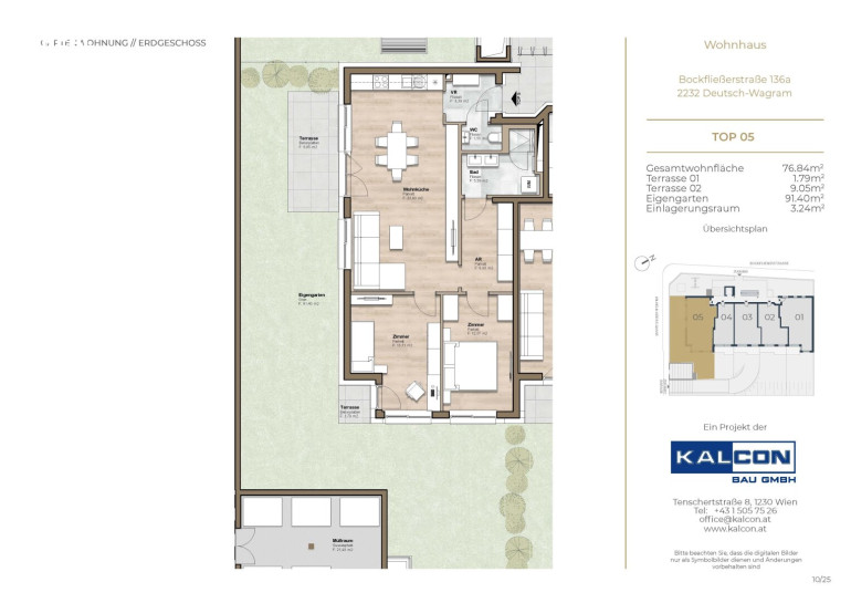 In Deutsch-Wagram entstehen 15 hochwertige Eigentumswohnungen mit Wohnflächen zwischen 44 m² und 80 m². Jede Wohnung verfügt über eine eigene Freifläche – sei es eine Terrasse, ein Garten, eine Loggia oder ein Balkon – und bietet somit maximalen Wohnkomfort.