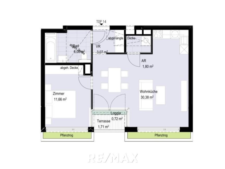 Diese 2-Zimmer-Wohnung im 1. Dachgeschoss (ohne Dachschrägen!) verfügt über eine ca. 2,43 m² große Loggia. Eine ca. 30,38 m² große Wohnküche ist ideal aufgeteilt. Über die Wohnküche gelangt man auf die südseitige Loggia. Ein weiteres Zimmer ist ebenfalls südseitig ausgerichtet. Das Badezimmer ist mit einer Badewanne und einem WC ausgestattet. Der Waschmaschinenanschluss befindet sich im praktischen Abstellraum neben der Küche.