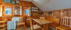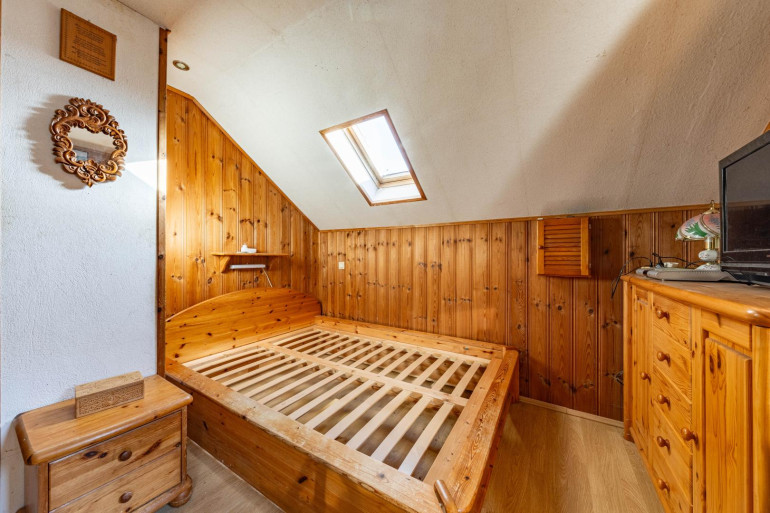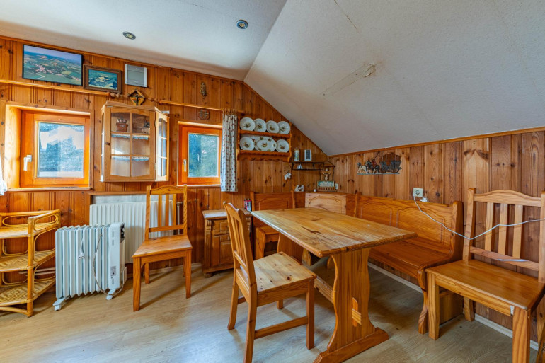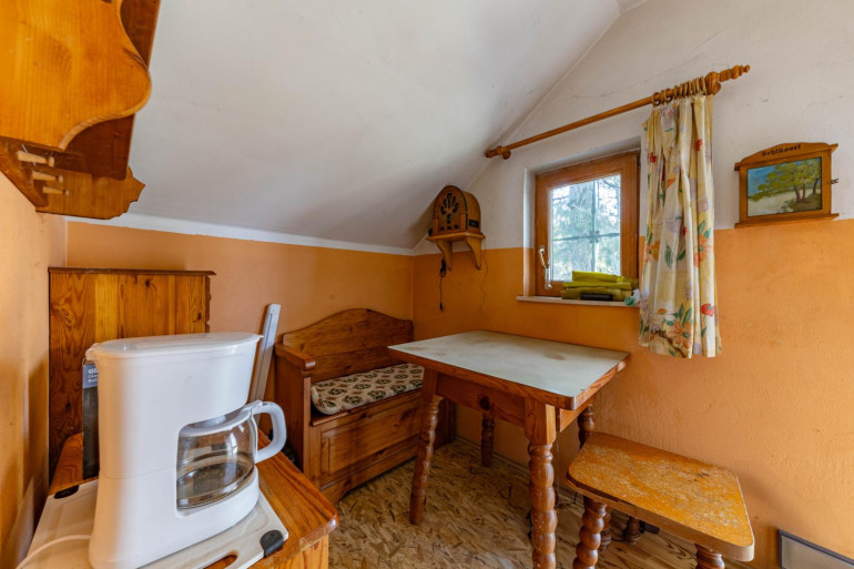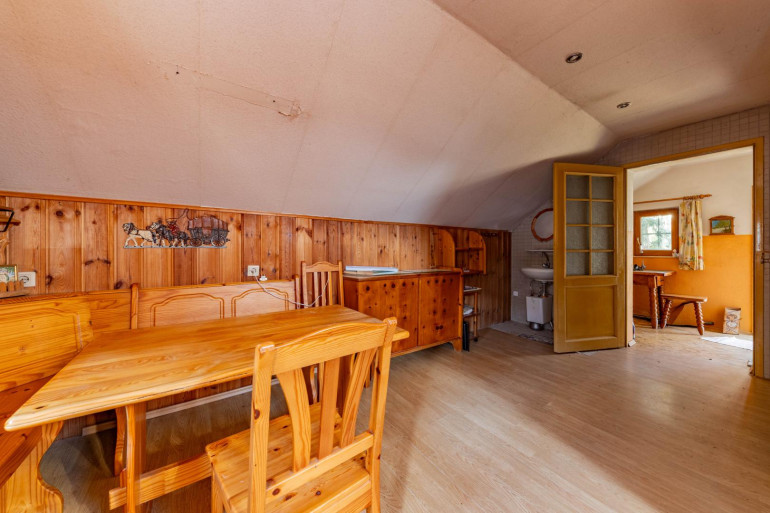 Im Erdgeschoss befindet sich auch die Holztreppe, die zum Dachgeschoss führt. Hier befindet sich ein weiterer Raum sowie ein Sanitärbereich mit Dusche und WC, eine Küche, ein Aufenthaltsbereich sowie der Ausgang zum Garten, der zum Entspannen und Genießen einlädt.