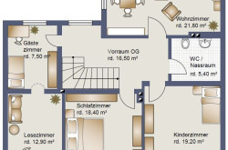 Das Obergeschoss mit ca. 97 m² Nutzfläche unterteilt sich in: Flur, Schlafzimmer, Kinderzimmer, WC, Nähzimmer, Gästezimmer und Lesezimmer sowie Abgang zum Erdgeschoss und Treppe zum Dachboden.