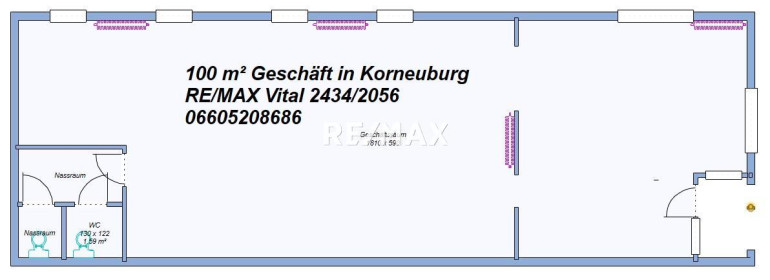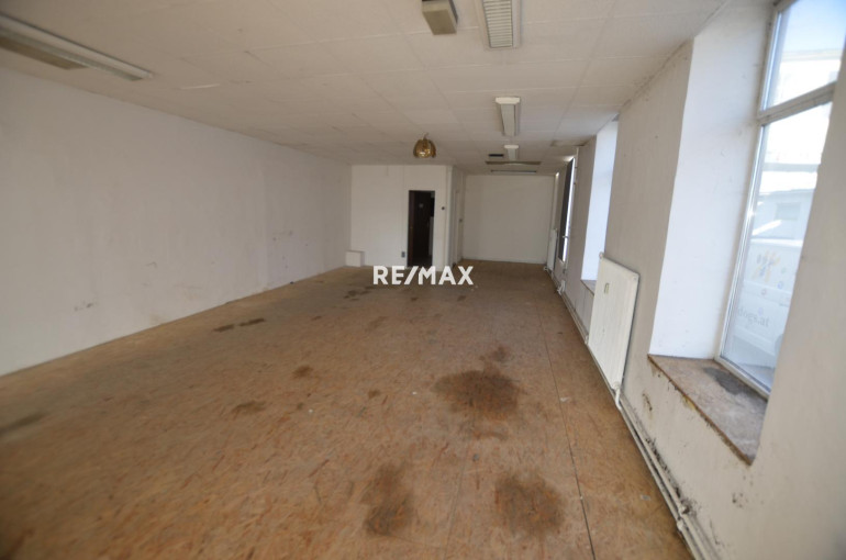 Das Geschäft besteht aus einem verglasten Eingangsbereich und mehreren Fenstern, die als Dekorations- und Schaufenster verwendet werden können. Der vordere Teil von rd. 36 m ist mit dem hinteren Geschäftsbereich durch eine Zwischenwand mit 2 Durchgängen unterteilt. Im Geschäft befindet sich auch ein abgetrennter Waschraum sowie Toiletten. Gesamtraummaße ca. 18x6 m. Raumhöhe ca. 266cm. Die Immobilie kann als Geschäft, Lager, Büro, Vereinslokal, Handwerk uva. verwendet werden.