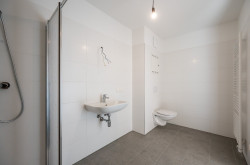 - ein Badezimmer, ausgestattet mit Dusche, Waschplatz, Waschmaschinen Anschluss und einem WC
