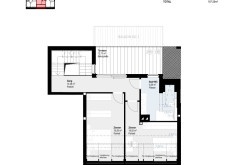 Die obere Ebene beherbergt zwei weitere Schlafzimmer sowie ein zweites Badezimmer mit WC. Eine zusätzliche, 12,71 m² große Terrasse, die in den ruhigen Innenhof ausgerichtet ist, lädt hier zum Entspannen ein.