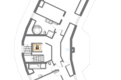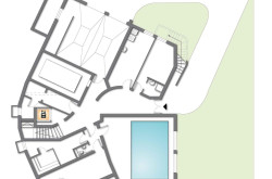 Im Untergeschoss des Gebäudes befinden sich Technik- und Abstellräume, sowie ein Schlafzimmer und der Pool- und Spa-Bereich. In diesem Stockwerk betritt man die Villa über den Haupteingang oder über die Garage. Eine geschwungene Treppe - und ein nachträglich eingebauter Lift - führen in das Obergeschoss, das die Wohnräume beherbergt. Hier befinden sich mehrere großzügige Wohnbereiche, ein Büro, die Küche, sowie ein Schlafzimmer mit angrenzendem Badezimmer. Der Zugang zur großen, süd-westlich ausgerichteten Terrasse ist ebenfalls vom Wohnbereich aus gegeben.