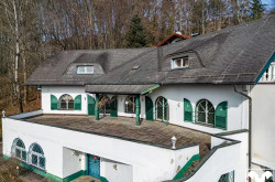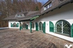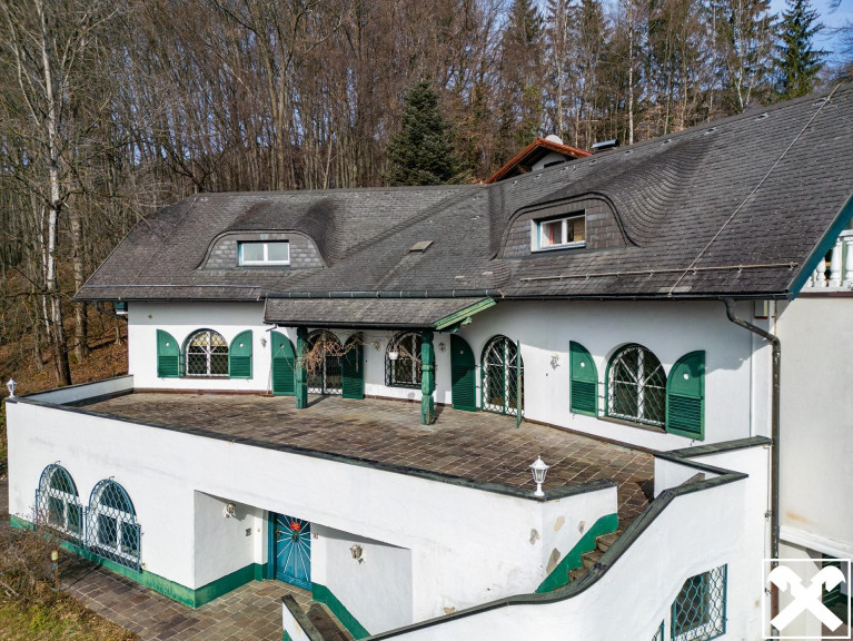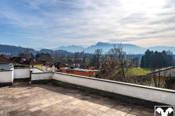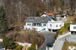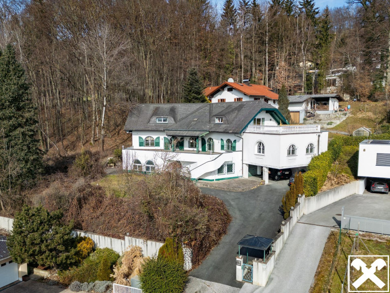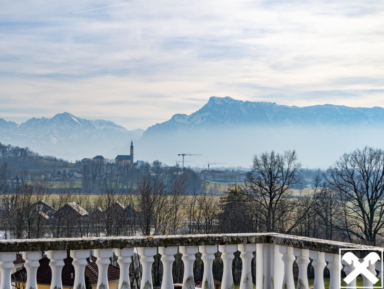 Die Villa aus den 1970er Jahren befindet sich am Ende einer Sackgasse in einer ruhigen Siedlung von Bergheim. Der majestätische Anblick wird durch die Hanglage, an der sie errichtet wurde, noch verstärkt. Dank dieser Hanglage bieten die Terrassen und Balkone des Hauses auch einen wunderschönen Blick über die Salzburger Berglandschaft und diverse Wahrzeichen wie die Wallfahrtskirche Maria Plain.