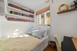 Individuell angefertigte Einbauten – darunter großzügige Bücherregale, fein gearbeitete Holzelemente und eine stilvolle Galerie – verleihen dem Zuhause nicht nur Charakter, sondern auch Struktur und Wärme.