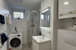 Das moderne Badezimmer verfügt über eine Walk-In Regendusche. Zusätzlich steht Ihnen eine brandneue Waschmaschine zur Verfügung. Außerdem wurde an eine stilvolle LED-Beleuchtung am Badezimmerspiegel gedacht, die für eine elegante Atmosphäre sorgt.