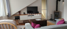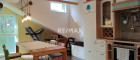 Großzügiger Wohn-/Ess-/Küchenbereich mit Kaminofen und Zugang zum westseitigen Balkon