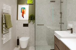 Das moderne Badezimmer überzeugt mit hochwertiger Ausstattung, einer bodentiefen Dusche sowie stilvollem Design.