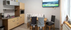 eine Küche mit Essbereich, ein Schlafzimmer, 2 Flachbild-Kabel-TVs und ein Badezimmer mit Dusche und WC.