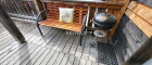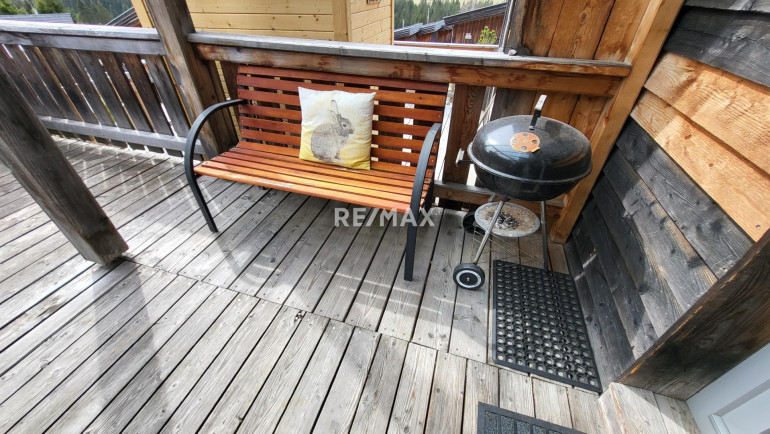 Vor dem Ferienhaus ist ein kleiner Abstellraum für Ski, Besen, Schneeschieber, Sonnenschirm und Liegestühle für die Terrasse.