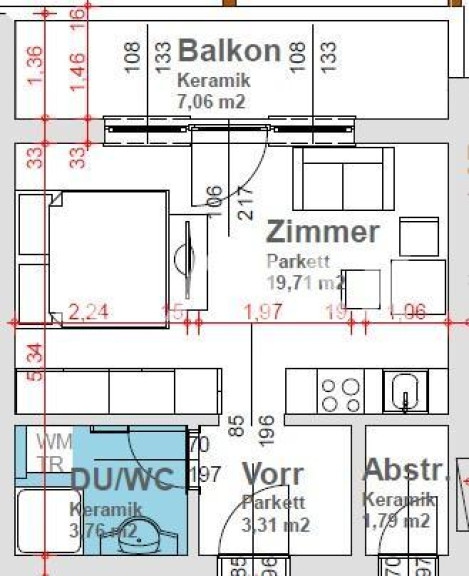 Vorraum, Bad/WC/DU, WC extra, Wohn/Schlaf-Koch und Essbereich