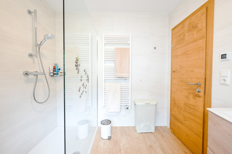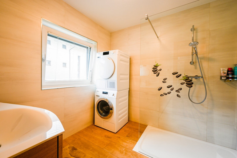 - Badezimmer: Das Bad verfügt über ein Fenster und ist mit einem Waschtisch und einer großen Dusche ausgestattet – für maximalen Komfort und Tageslicht. Auch Waschmaschine und Trockner finden hier Platz.