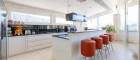 Die Küche beindruckt mit einer Kochinsel mit dunkler Quarzarbeitsfläche und Ceranfeld, akzentuiert durch eine schwebende Edelstahlhaube und schlanke Barhocker. Grifflose, weiße Fronten verbergen großzügigen Stauraum und integrieren High-End-Geräte, während dreifach verglaste Panorama-Fenster den Watzmann ins Küchenambiente holen.