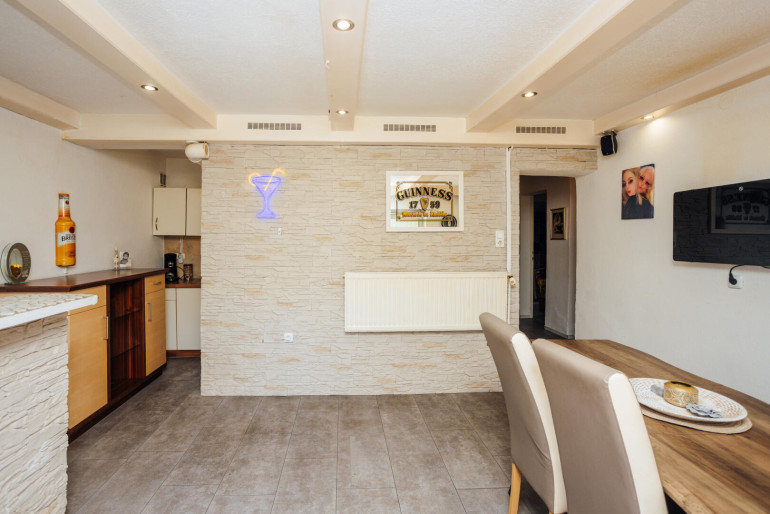 - Ausgebauter Bereich (ca. 45 m²): Hobbyraum mit Bar und Küche, separates WC, kleines Bad sowie eine Werkstatt.