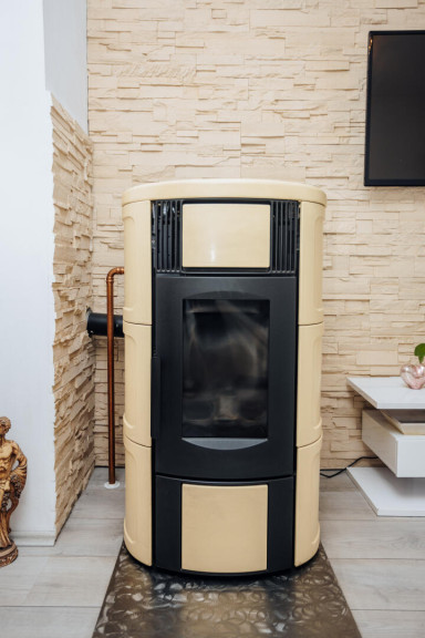 - Pelletbetriebener Schwedenofen im Wohnzimmer als Hauptwärmequelle