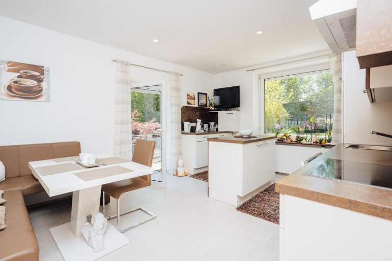 Mit eigenem Eingang bietet die Dachgeschosswohnung zusätzlichen Komfort. Besonders hervorzuheben sind der überdachte Balkon sowie die großzügige Terrasse mit Grillplatz – ideal für gemütliche Abende im Freien.