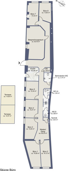 - insgesamt sind 7 Büroräume und ein größerer Besprechungsraum vorhanden