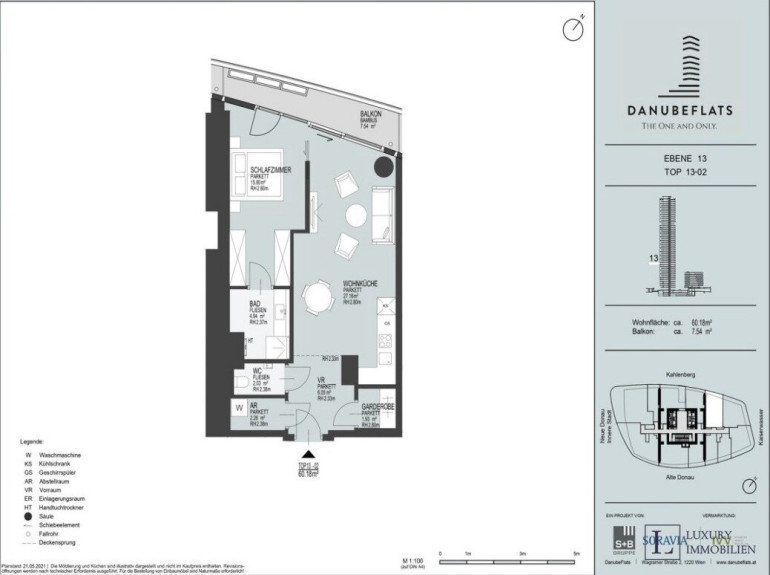 In bester Lage direkt an der Donau bieten die 48 Stockwerke und ca. 180 Meter Höhe unvergleichliche Ausblicke und Wohnkomfort auf Top-Niveau.