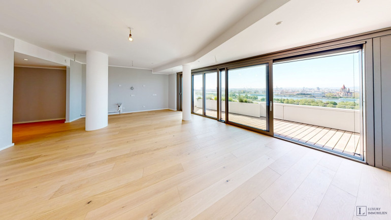 Zum Verkauf steht eine großzügige, helle und hochwertig ausgestattete 3-Zimmer-Wohnung im 11. Stock mit atemberaubendem Blick über die Donau und die Skyline Wiens.