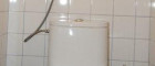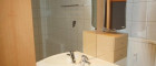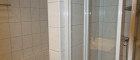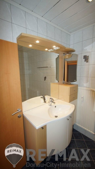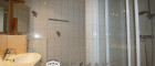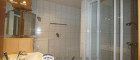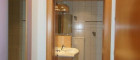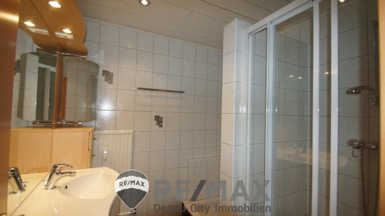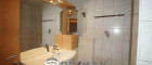 Das Badezimmer mit schönen Badmöbeln - Waschtisch mit Spiegelschrank und sogar Doppeldusche befindet sich neben dem extra WC und einem Zwischenraum.