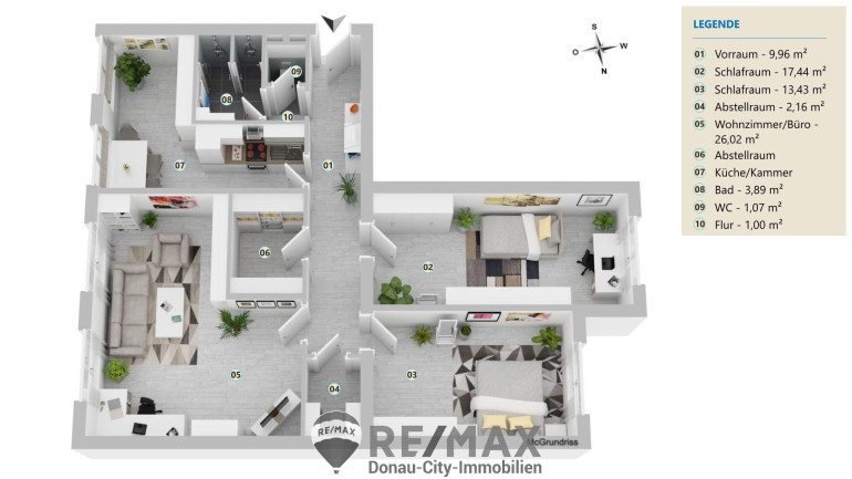Auf der gegenüberliegenden Seite sind die beiden Schlafräume welche teilmöbliert übergeben werden.