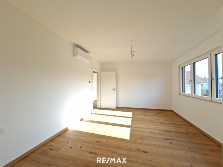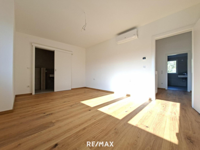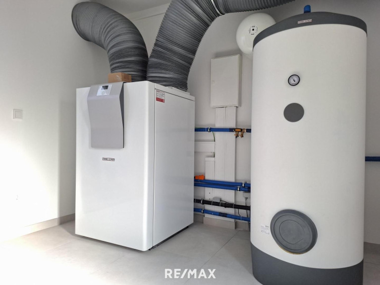 Für reichlich Tageslicht sorgen die bodentiefen Fenster auf der Westseite im Erdgeschoß. Das ganze Haus wird mittels einer Fußbodenheizung temperiert was für ein besonders behagliches Wohnklima sorgt. Die Heizung wird von einer ökologisch nachhaltigen Luft-Wasser-Wärmepumpe inklusive Kühlfunktion gespeist. Eine Klimaanlage und Außenrollläden gehören ebenso zur Grundausstattung. Somit bleibt Ihr Haus auch in den heißen Sommertagen angenehm temperiert.