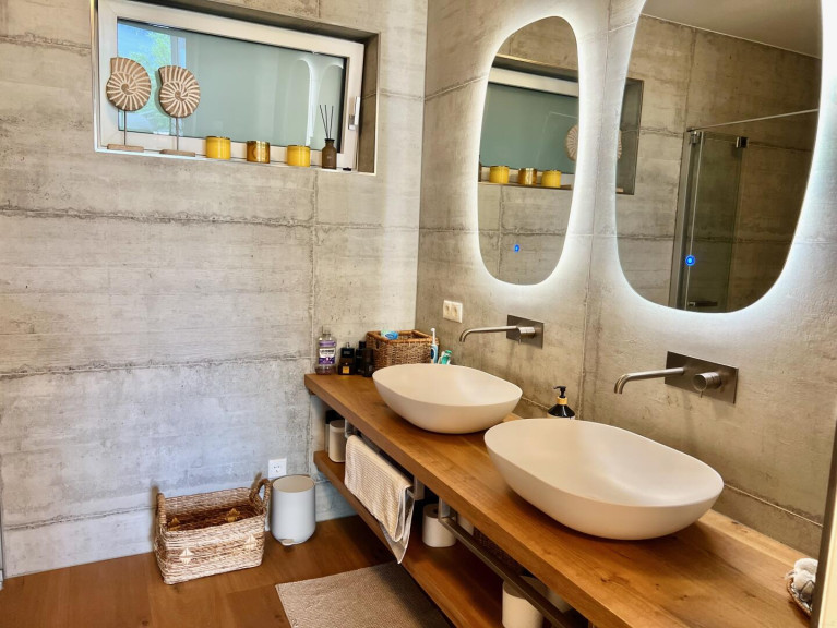 Ein Masterbedroom mit begehbarem Kleiderschrank und en-suite Badezimmer samt WC, sowie ein weiteres Schlafzimmer mit eigenem angrenzendem Badezimmer mit WC und Balkon bieten ausreichend Platz. Eine Zirbenholz Infrarotkabine findet am Balkon Ihren Platz.