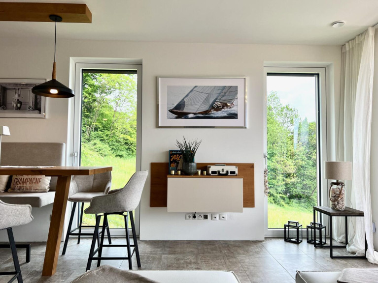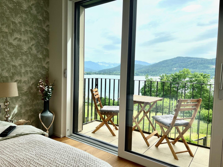 The stylish apartment with a living space of approx. 86 m² is located on the 1st floor of the small complex built in 2020 and is literally enthroned above Lake Wörthersee. It has a spacious and open kitchen, living and dining area with a beautiful balcony and a stunning and sweeping view of Lake Wörthersee and the Karawanken mountains.