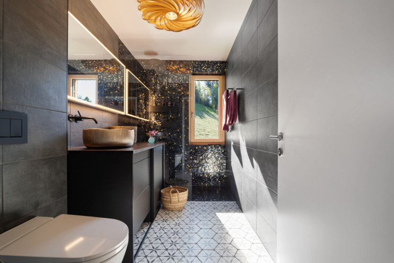 • Stilvolle Fliesen im Bad: Mosaikfliesen Bisazza Tiana in der Dusche und elegante italienische Bodenfliesen