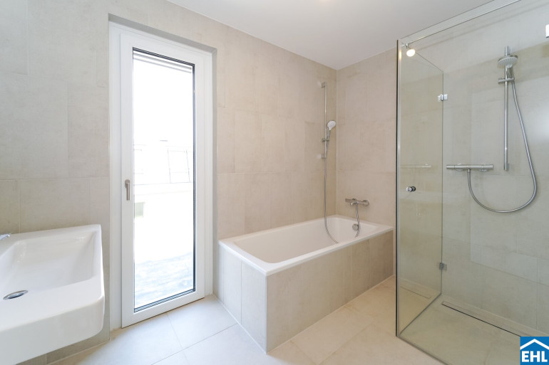 Die Liegenschaft vereint nicht nur architektonische Eleganz, sondern setzt auch in puncto Ausstattung auf höchste Standards. Große Fenster mit Dreifachverglasung lassen viel Licht in die Wohnungen und sorgen für eine angenehme Wohnatmosphäre. Raffstores bieten flexiblen Sonnenschutz und Privatsphäre. In den Wohnräumen sorgen edle Parkettböden für eine warme, wohnliche Atmosphäre, während die Bäder mit großformatigen Feinsteinzeugfliesen modern und stilvoll gestaltet sind.