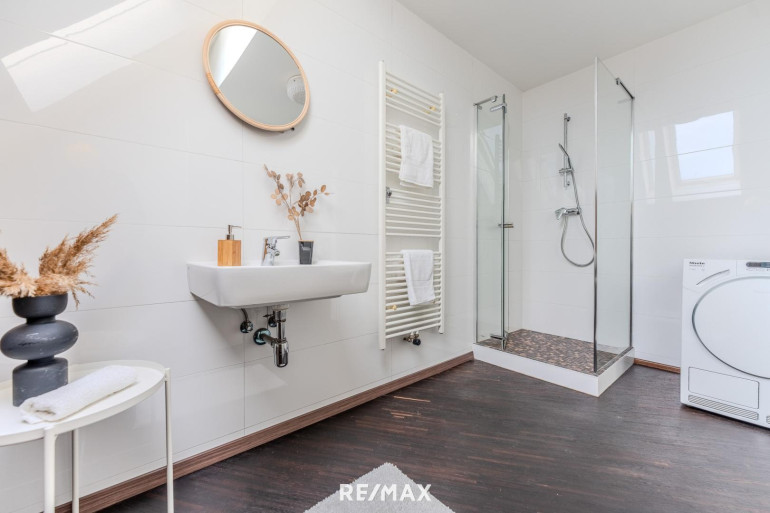 Das Highlight des Erdgeschosses ist der offene Wohnbereich mit vielen Gestaltungsmöglichkeiten in Verbindung zum Schlafbereich, getrennt durch einen Tischlereinbauschrank mit integriertem Fernseher. Dieser verbindet sich nahtlos mit einem luxuriösen Badezimmer, das keine Wünsche offenlässt: Badewanne, Walk-In Dusche und WC – alles eingefasst in edlen Fliesen und ergänzt durch Armaturen, die mit ihrer Qualität und Eleganz überzeugen.Ein großzügiges Zimmer (ca. 20 m²) mit eigenem Badezimmer und Walk-In Dusche eröffnet zahlreiche Nutzungsmöglichkeiten – ob als privater Gästebereich, Homeoffice oder Hobbyraum. Ein separat zugängliches WC mit Handwaschbecken sorgt für zusätzlichen Komfort.