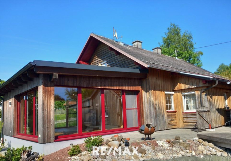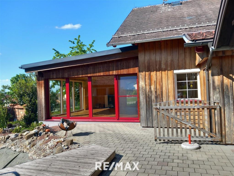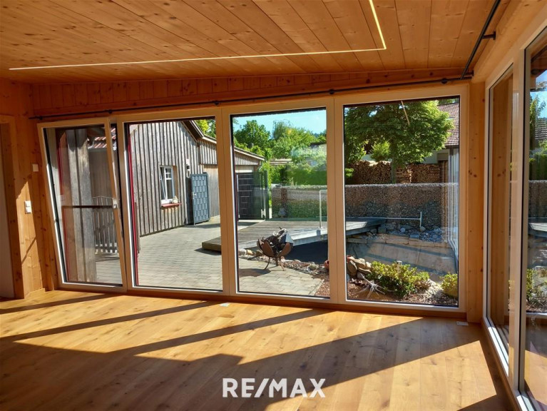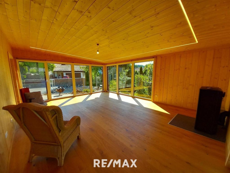 Im Erdgeschoss befindet sich ein gemütliches Wohn-/Esszimmer (Wintergarten) mit Holzdecke, das 2021 dazu gebaut wurde. Ein Pelletsofen sorgt hier für wohlige Wärme – ein perfekter Ort für entspannte Stunden zu jeder Jahreszeit.