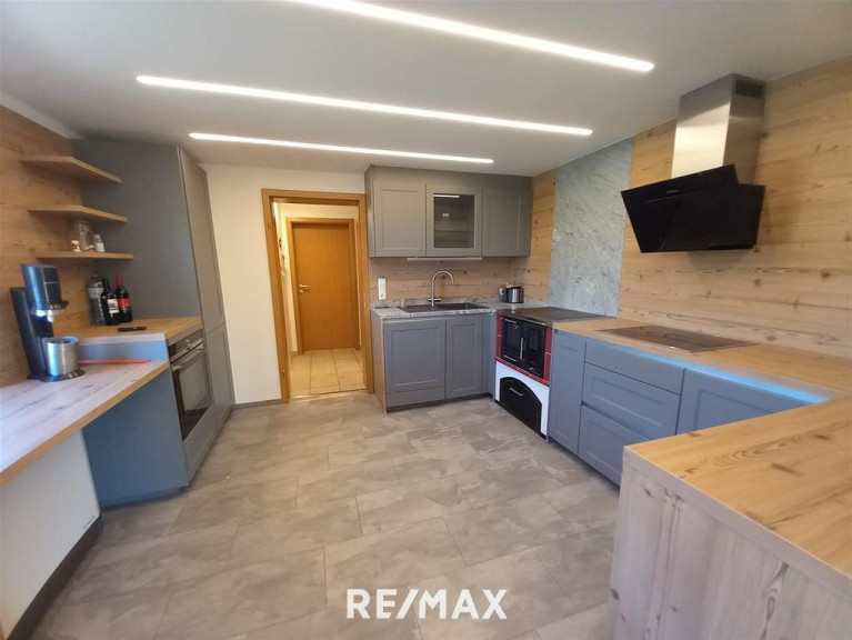 Angrenzend liegt die neuwertige, geschmackvoll eingerichtete Küche mit zusätzlichem Holzofen – ideal für Genießer, eine Speis, zwei weitere Zimmer, ein
